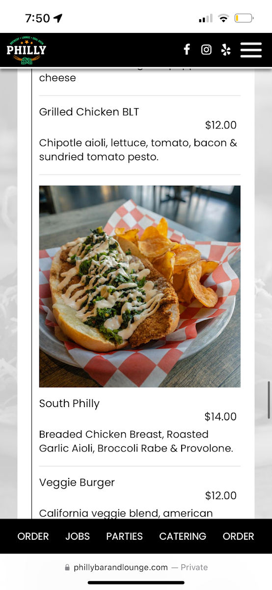 The menu features a delightful range of options, showcasing the best of American bar fare with a twist. When visiting, don’t miss their signature Philly Sandwich, a must-try that captures the heart of the bar's namesake, bursting with flavor and perfectly crafted. For those who prefer a finger-licking appetizer, the Garlic Parm Boneless Chicken Wings are sure to impress with their crispy exterior and savory seasoning, leaving your taste buds dancing. Another favorite amongst patrons is the Nashville Hot Chicken Sandwich, which pairs perfectly with their delicious fries. Desserts and seasonal cocktails only elevate the experience further!